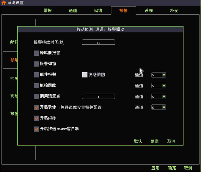 2.鼠標移動到系統設置界面中的“報警-移動偵測”選項,則系統打開硬盤錄像機移動偵測的界面,并單擊選中任意通道的“啟用”選項,分別配置好布防時間、移動偵測區域以及移動偵測報警聯動項,即可開啟該通道的移動檢測功能。(硬盤錄像機的移動偵測報警聯動功能可根據需要進行設置)如下圖所示: