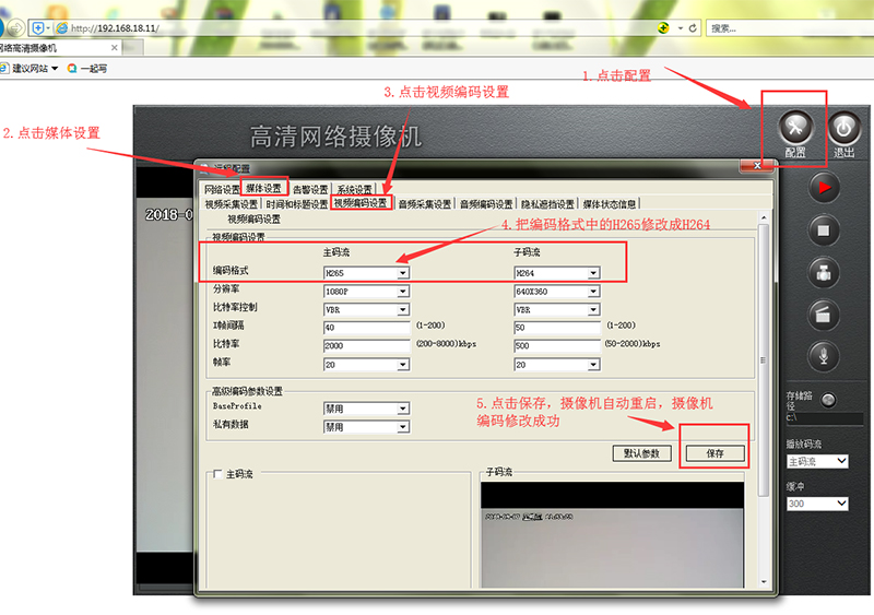 2.點擊“配置”,選擇“媒體設置”到“視頻編碼設置”,將編碼格式中的H265格式修改成H264格式,點擊保存即可