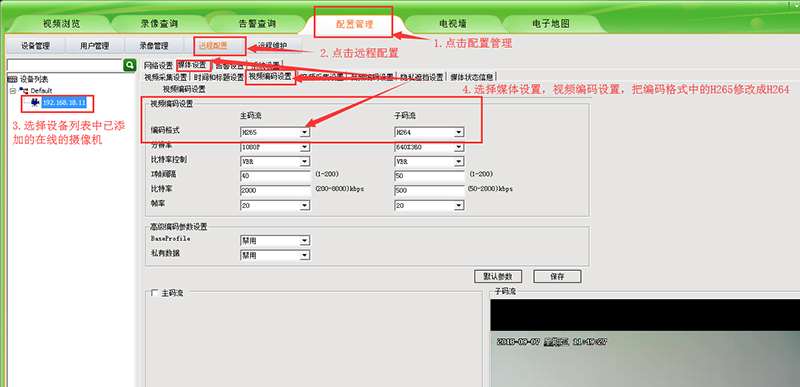 1.先將需要修改的攝像機IP添加到電腦客戶端中,然后點擊“配置管理”-遠程配置-在左邊設備列表中選擇已經添加到客戶端的攝像機IP-選擇“媒體設置”到“視頻編碼設置”,將編碼格式中的H265格式修改成H264格式,點擊保存即可