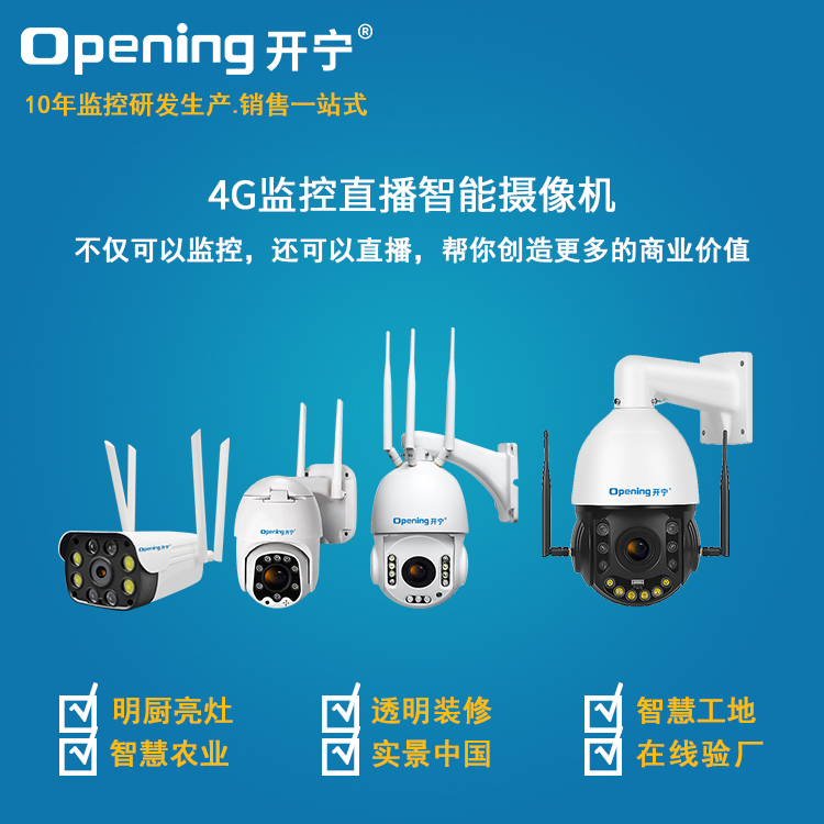 要想實現“慢直播”,只需要一臺電腦和一臺開寧監控直播攝像機,慢直播設備大多長時間安裝在戶外進行固定角度直播,那么該設備就需要能在戶外安裝,并且使用4G/5G網絡等方式進行傳輸視頻,設備還要具備防水能力!開寧“慢直播”監控直播攝像機設備可根據直播場景選購不同的設備,以下是開寧監控直播攝像機系列產品,適用于各大慢直播應用場景!