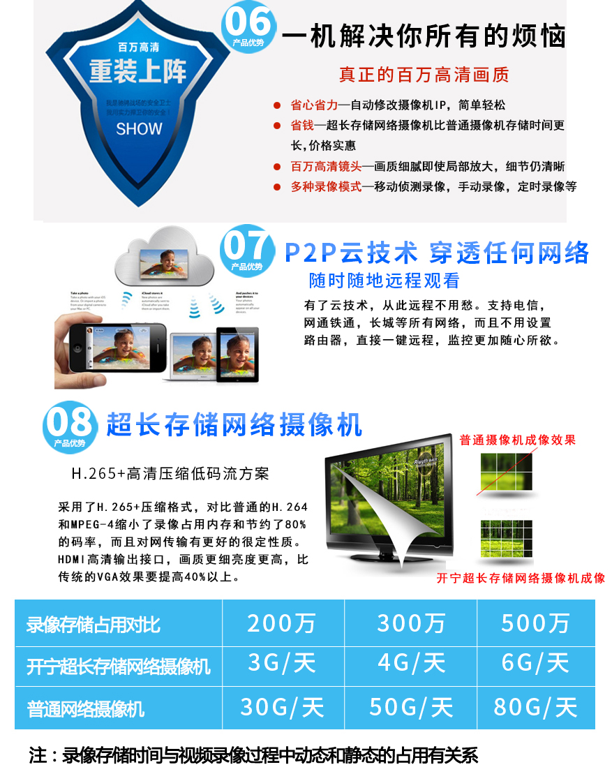 ★智能黑光全彩、1080P/1944P(200萬/500萬)、超長存儲、智能高清、全網通、低碼流、低照度、低功耗、H.265+雙碼流、防靜電、防浪涌、過壓保護、移動偵測報警。