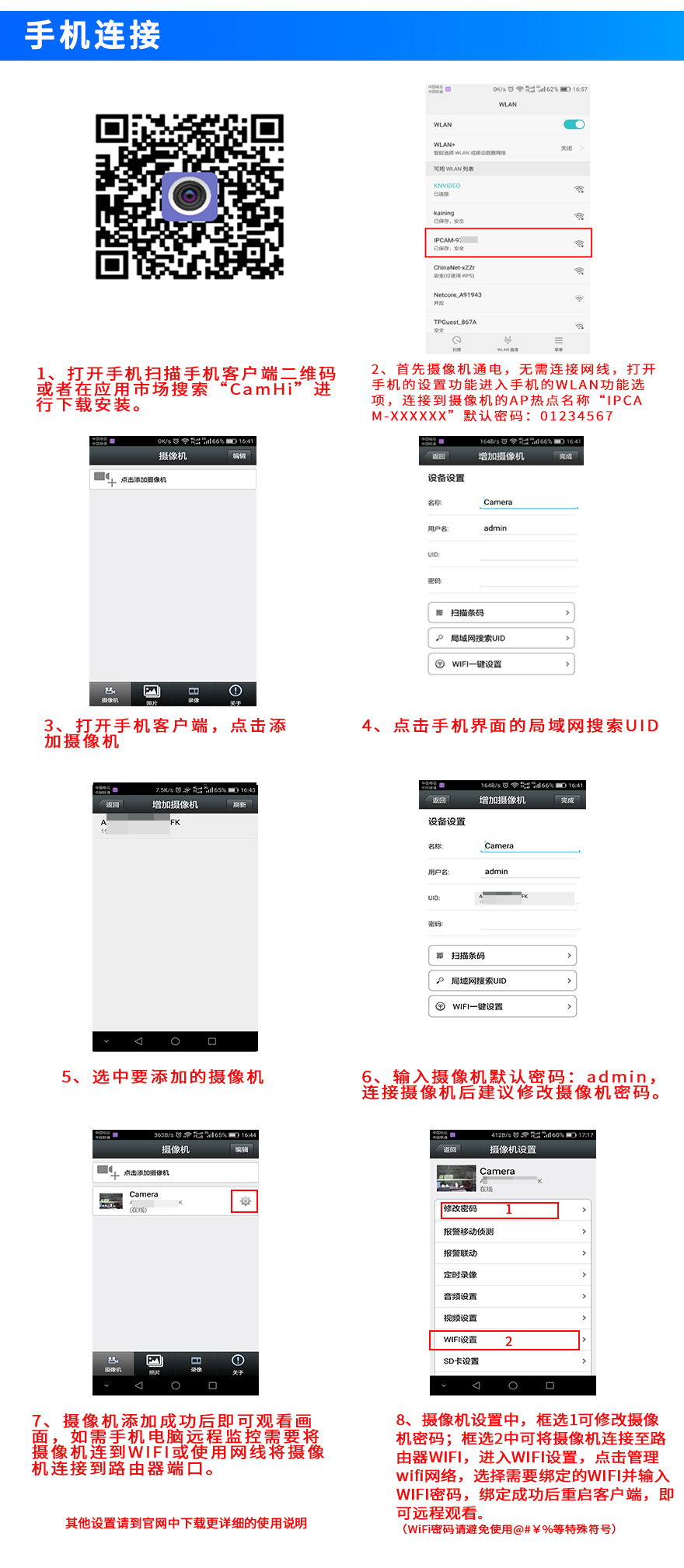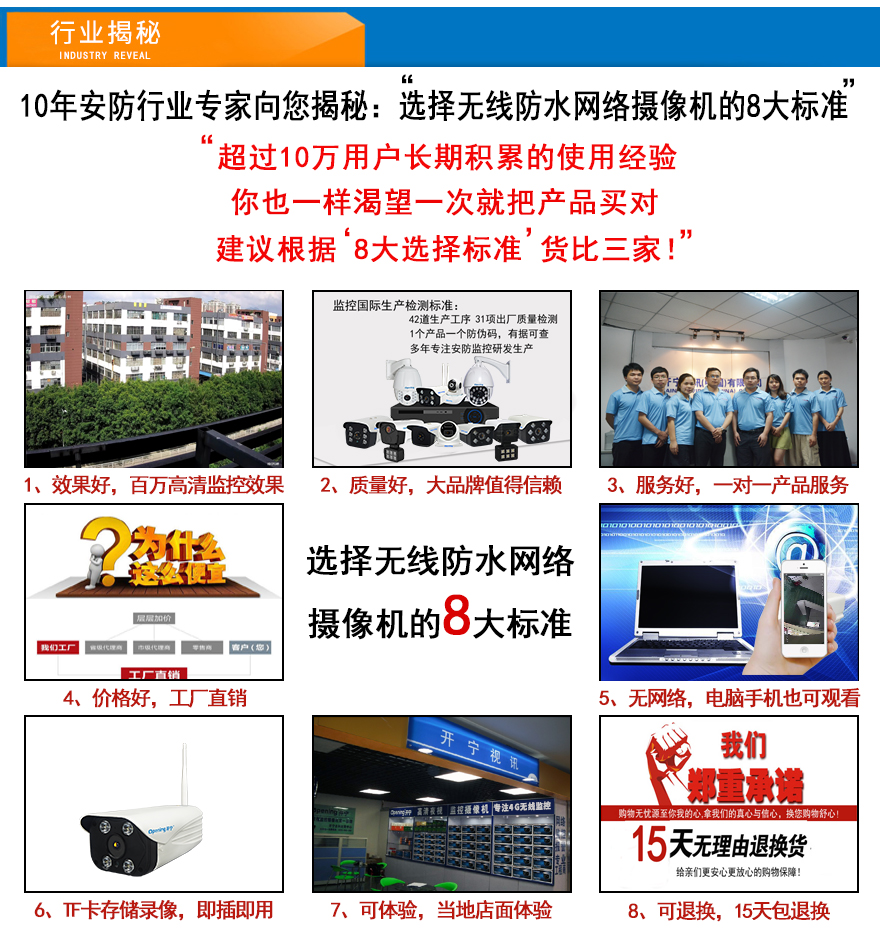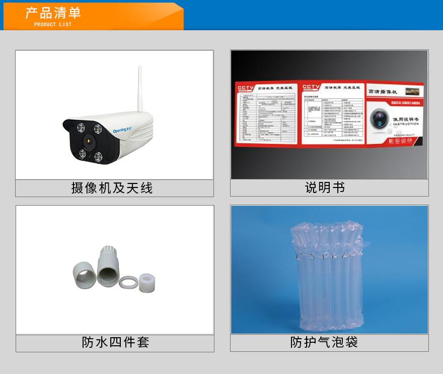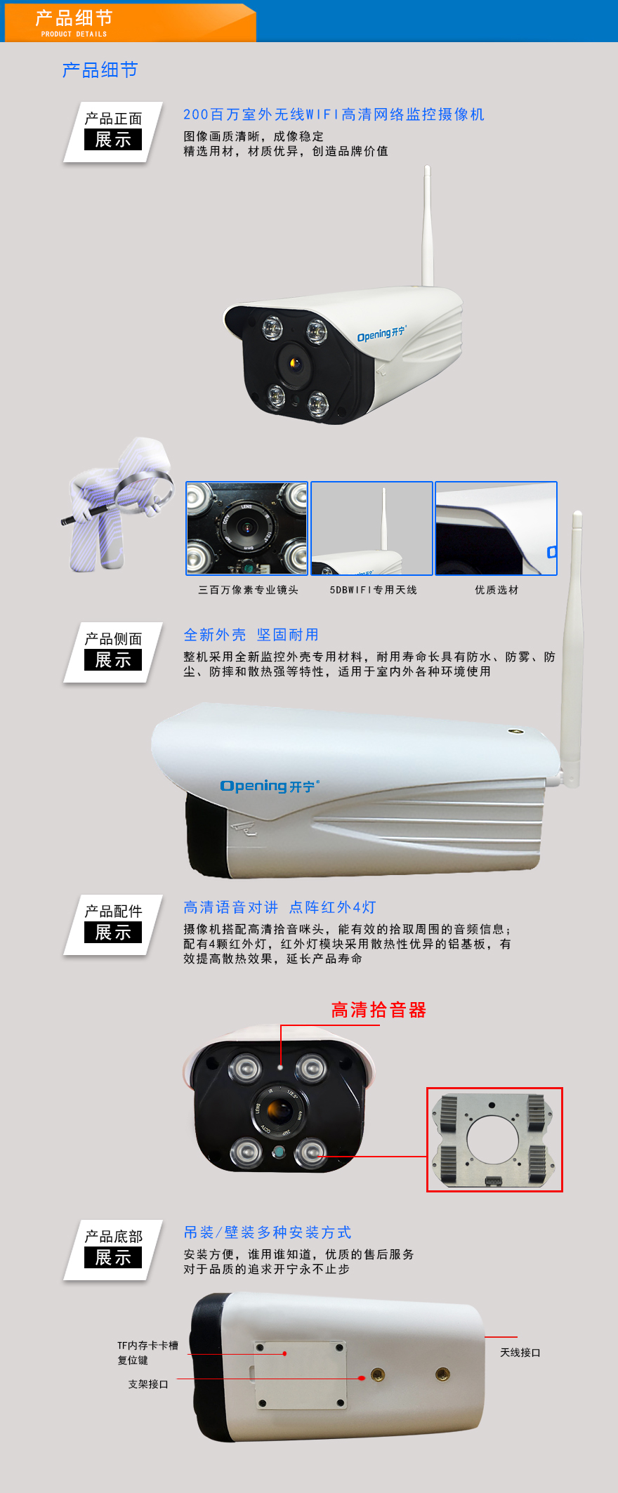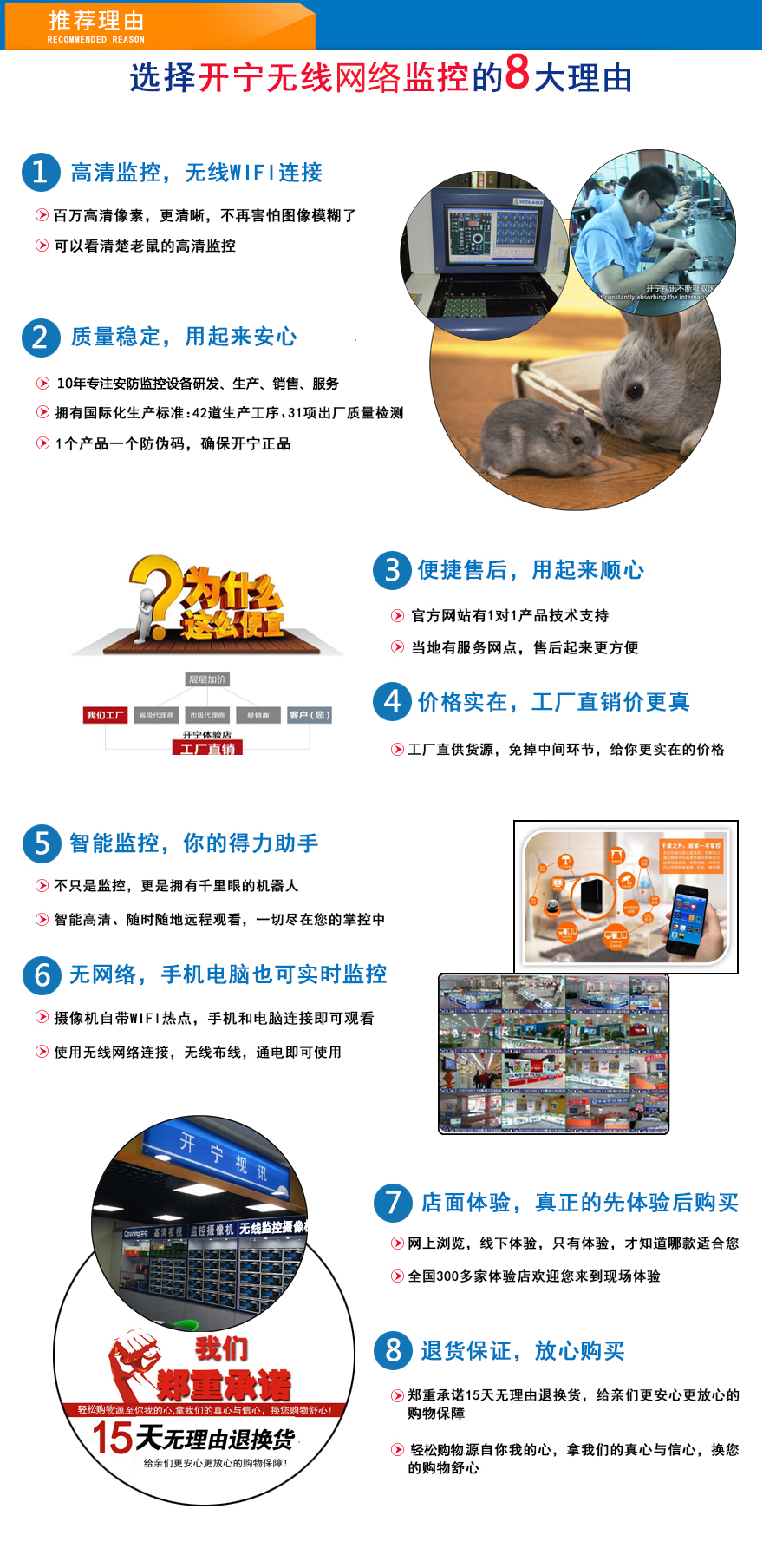 - 開(kāi)寧無(wú)線WIF防水網(wǎng)絡(luò)高清攝像頭,一個(gè)機(jī)器就相當(dāng)于一套監(jiān)控系統(tǒng);智能高清(960P/1080P),隨時(shí)隨地手機(jī)/電腦遠(yuǎn)程觀看;自帶AP(WIFI)熱點(diǎn),沒(méi)有網(wǎng)絡(luò)也可以正常使用;簡(jiǎn)易安裝,插內(nèi)存卡通電即用;4顆大功率點(diǎn)陣紅外燈,紅外10-30米左右,定焦鏡頭4MM,6MM可選),DC12V供電。