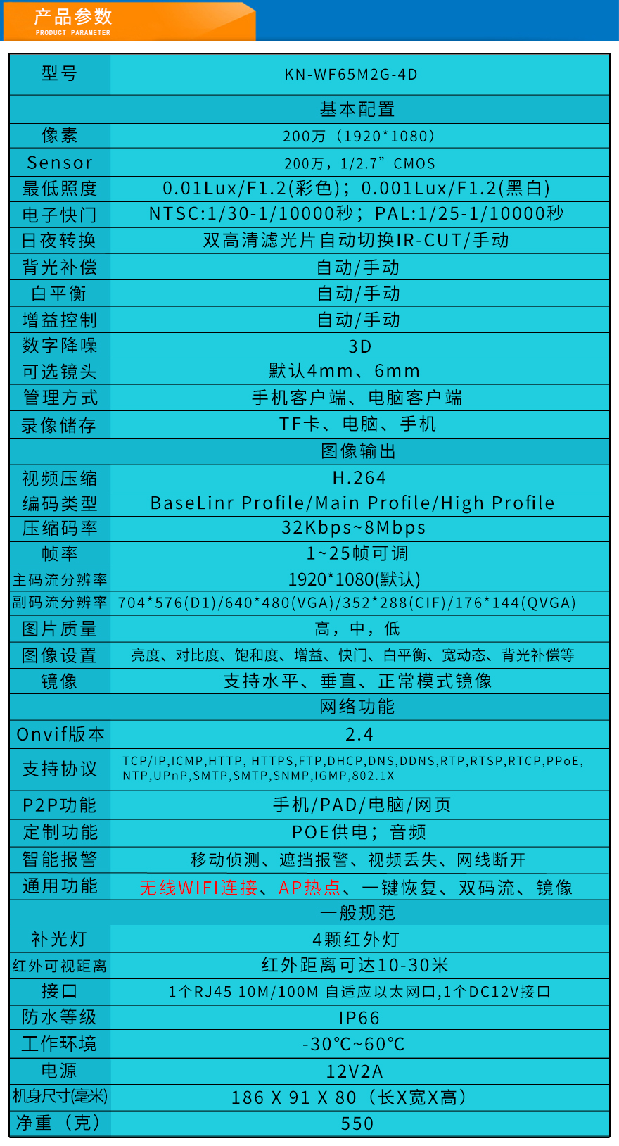- 室外無(wú)線防水網(wǎng)絡(luò)攝像機(jī) KN-WF65M2-4D