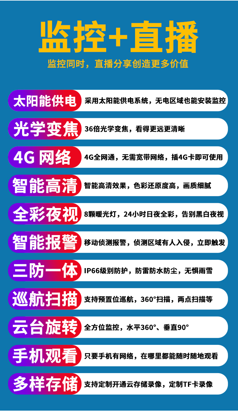 - 1、500萬/800萬6寸36倍監控直播全彩智能高清球機,一個球機就是一套監控直播系統;支持360度旋轉,最高轉速可達60度/S,支持預置點和巡航,36倍光學變焦,半金屬外觀,IP66防水等級;