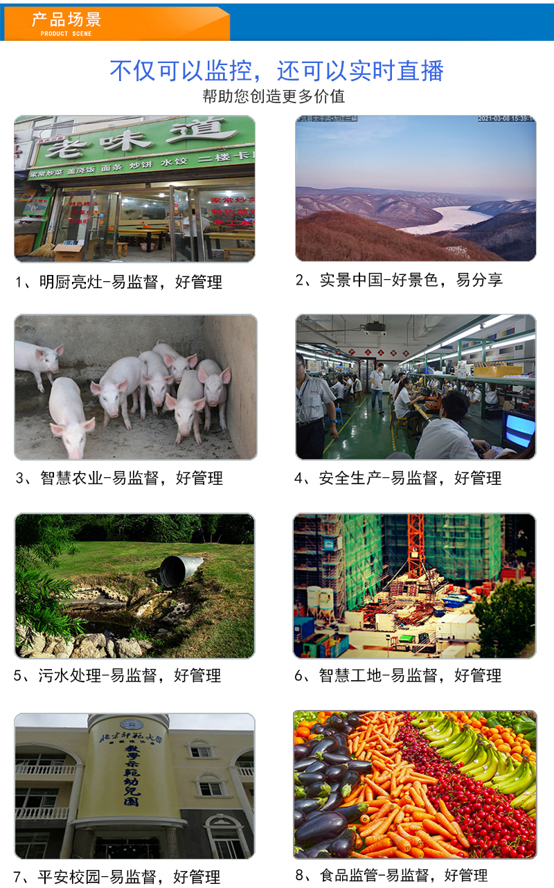 3、明廚亮灶.透明裝修.智慧農業.食品溯源.實景中國.在線驗廠.店鋪直播.展會直播等實時監控直播;