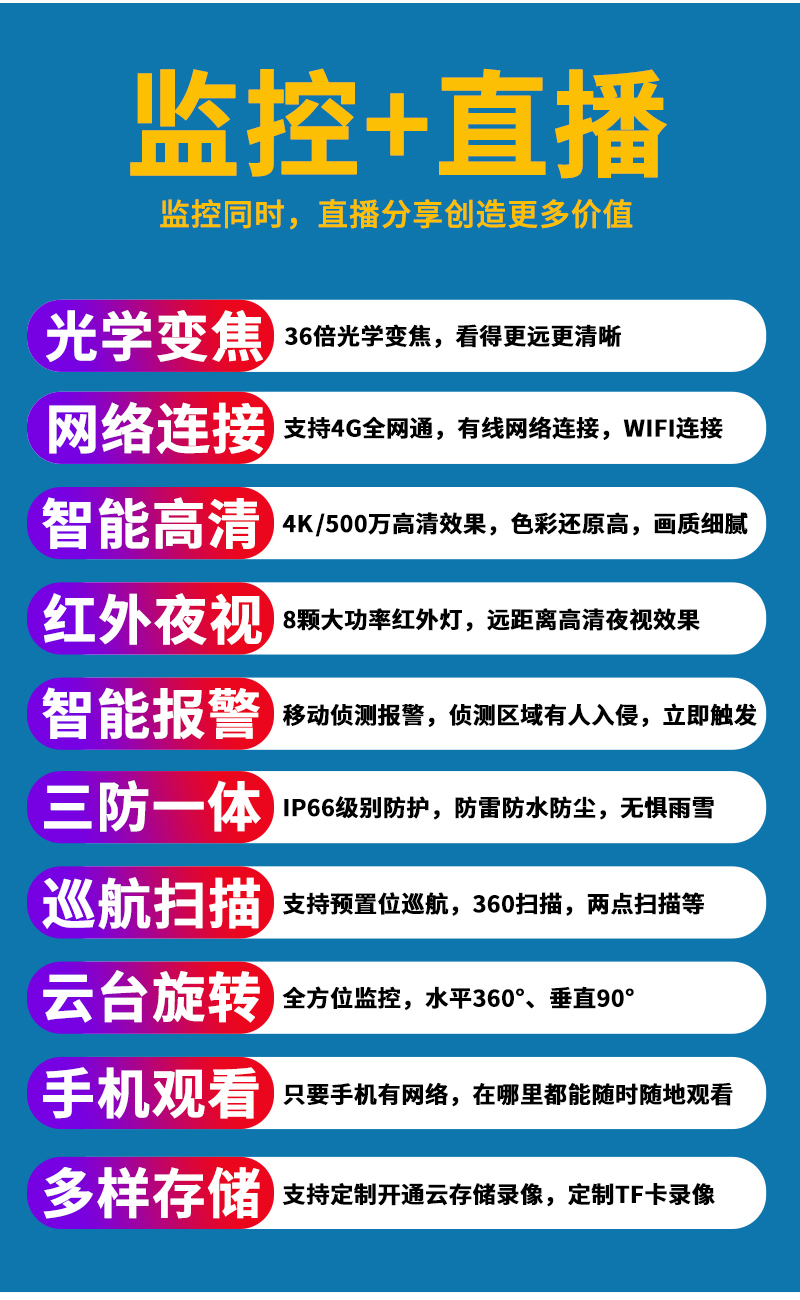 - 1、300萬/500萬/800萬4.5寸36倍監控直播智能高清球機,一個球機就是一套監控直播系統;支持360度旋轉,最高轉速可達60度/S,支持預置點和巡航,36倍光學變焦,半金屬外觀,IP66防水等級;