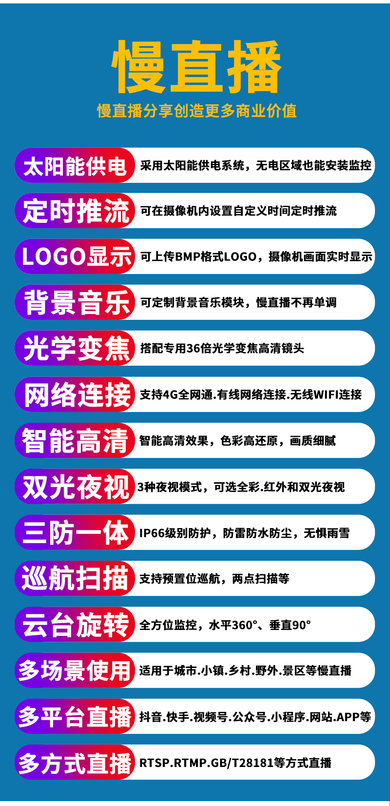 2、內(nèi)置智能4G模塊,沒有寬帶網(wǎng)絡(luò)的地方也能實(shí)現(xiàn)實(shí)時慢直播; 3、不僅可以監(jiān)控監(jiān)管錄像,還可以實(shí)時慢直播分享創(chuàng)造更多商業(yè)價值; 、4、美景中國.智慧景區(qū).城市慢直播.動物慢直播.融媒體慢直播.央視頻慢直播.戶外直播等慢直播;
