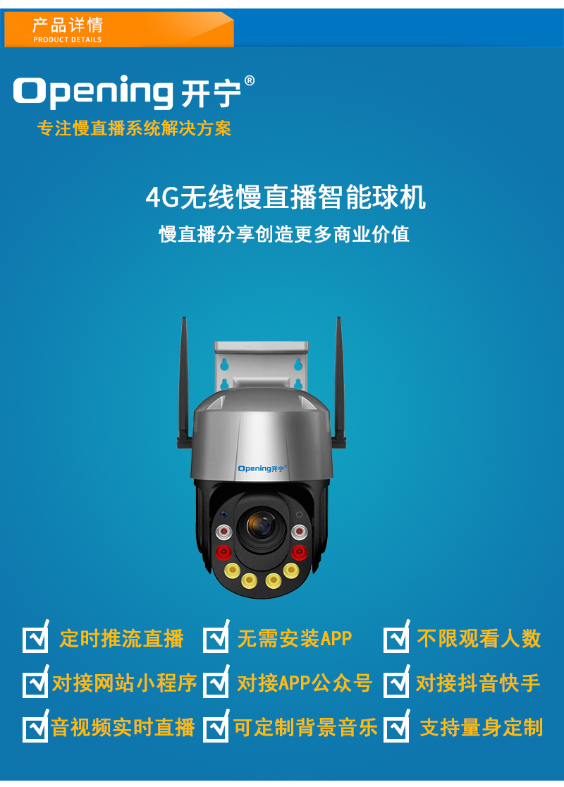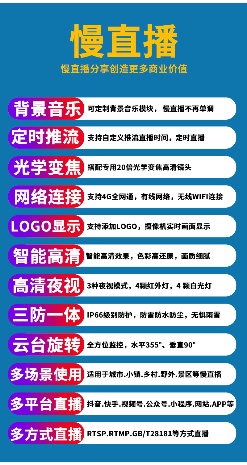 - 1、300萬4.5寸20倍有線/WIFI慢直播智能球,1個球機就是一套慢直播系統;支持水平和垂直旋轉; 2、不僅可以監控監管錄像,還可以實時慢直播分享創造更多商業價值; 3、景點直播.美麗鄉村.城市慢直播.農業慢直播.文旅慢直播.融媒體慢直播.戶外直播等慢直播; 4、無需下載安裝APP,簡單實用;不限觀看人數,創造更多商業價值; 5、RTMP推流慢直播智能球機;可生成監控監管直播二維碼,只需掃碼即可觀看慢直播; 6、可接入網站.公眾號.小程序.APP;可對接抖音.快手.視頻號.京東.淘寶.拼多多等平臺; 7、支持GB/T28181協議;可接公安.食品.工地.生產.教育.畜牧.旅游等監管部門平臺; 8、高清慢直播、本地錄像錄音、報警多功能于一體;支持64/128G/256G內存卡; 9、4顆高效能點陣紅外燈,4顆高效能點陣白光燈,20倍變焦高清鏡頭,夜視5-100米; 10、APP可選擇紅外模式、全彩模式和智能模式三種模式其中一種模式; 11、智能模式,沒有物體移動紅外燈亮,有物體移動白光燈亮; 12、內置高清保真拾音器,有聲有色實時慢直播;高清晰大功率喇叭,APP語音對講;DC12V供電; 13、免費提供集中管理平臺,可實現集中管理慢直播攝像頭,有效提高工作效率;
