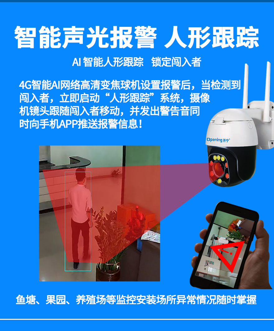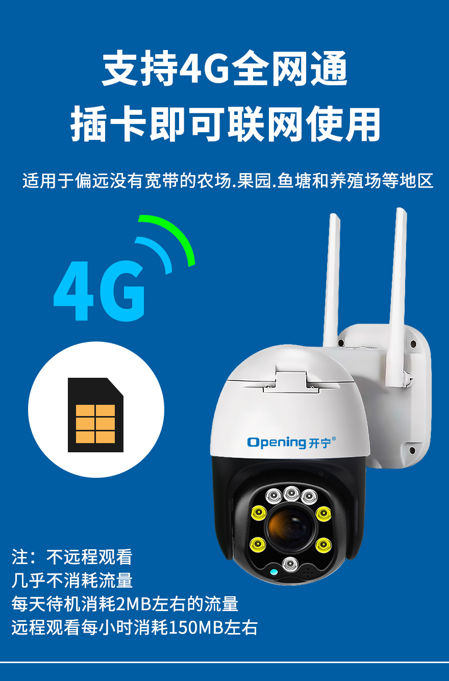 2、內置智能4G模塊;適用場所:養殖/種植/工地/公園/公路/野外等沒網絡地方; 3、2.5寸6倍變焦小球,可拉遠拉近;水平旋轉:0°~320°,垂直旋轉:0°~90°; 4、海思H.265壓縮算法,超長存儲錄像;最大支持256G存儲卡(30-60天左右錄像);