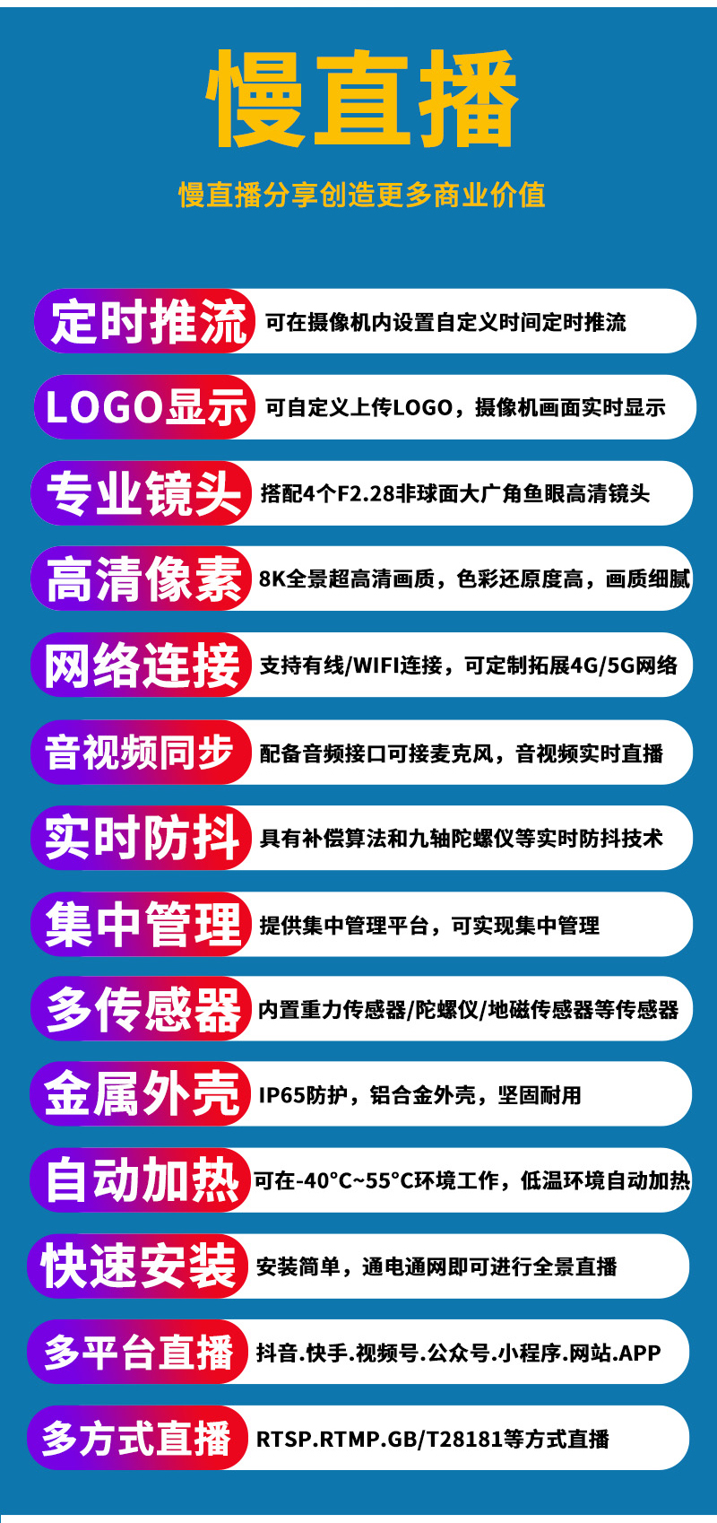 IP65三防8K全景相機,機內(nèi)拼接、機內(nèi)推流、遠程管理、支持7x24小時室內(nèi)長時間直播/監(jiān)控監(jiān)管,應用場景在大型會議室、警室、法院等,2.0新版遠程控制系統(tǒng),方便進行設備自主遠程管理。