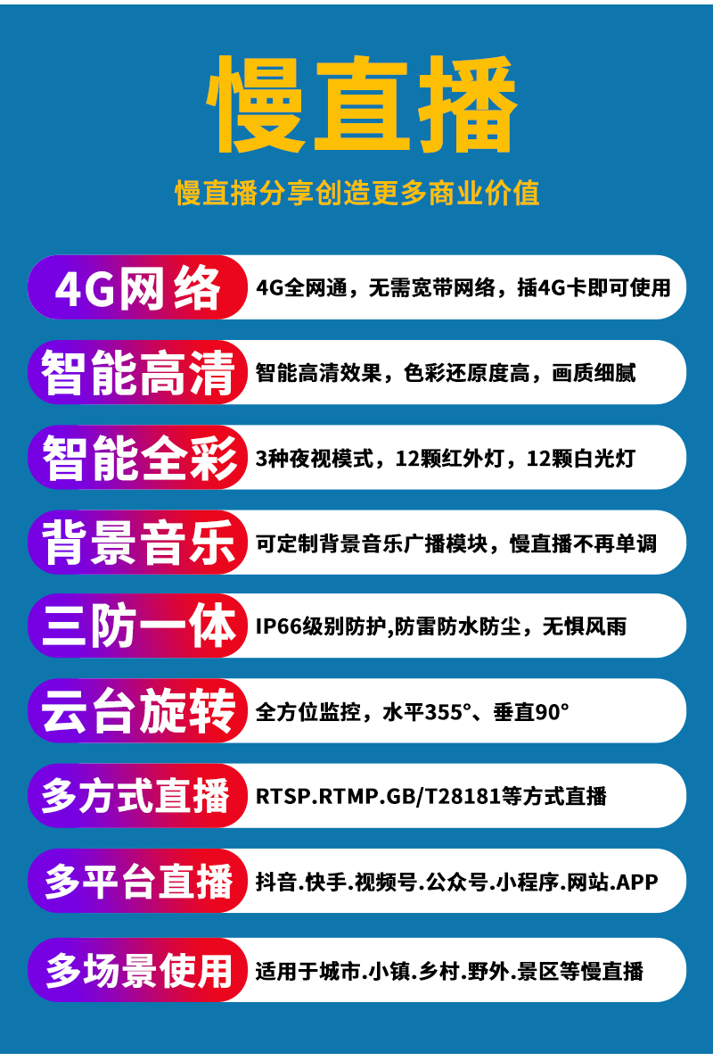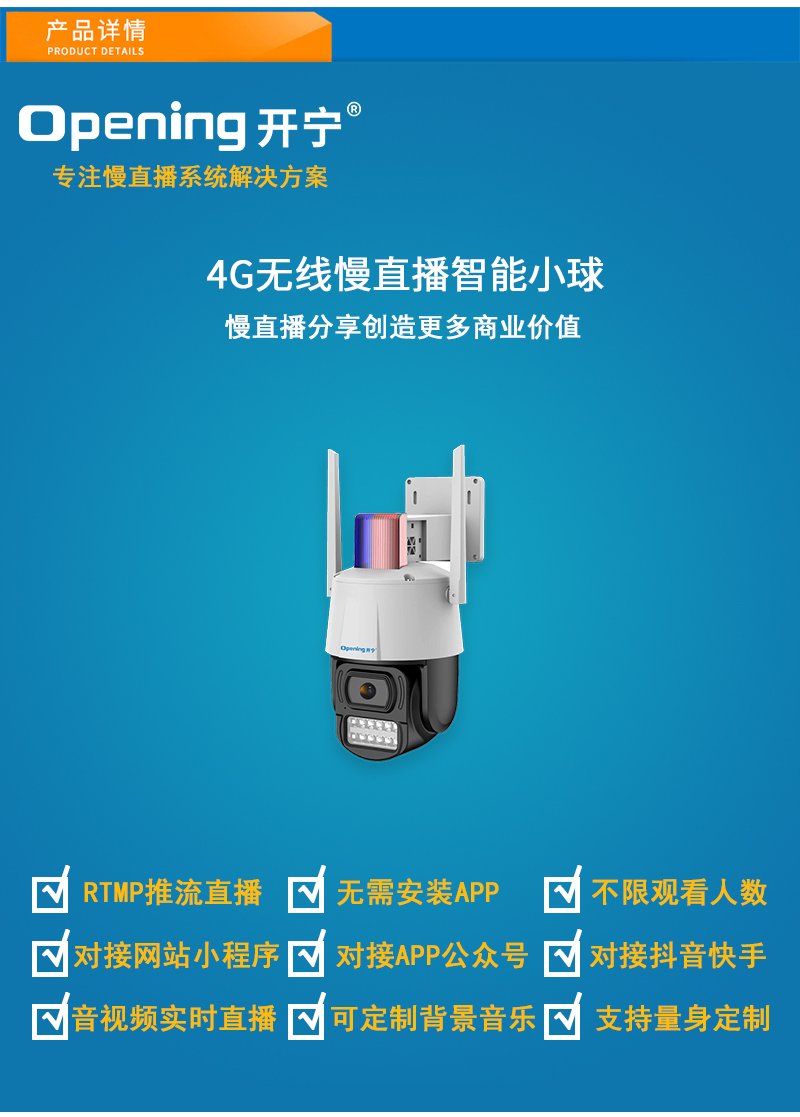 - 1、4G300萬慢直播智能小球,一個小球就是一套慢直播系統; 2、不僅可以監控監管,還可以實時慢直播分享創造更多商業價值; 3、明廚亮灶.食品溯源.城市慢直播.美麗鄉村.農業慢直播.景點慢直播.戶外慢直播等慢直播; 4、無需下載安裝APP,簡單實用;不限觀看人數,創造更多商業價值; 5、RTMP推流直播高清攝像頭;可生成慢直播二維碼,只需掃碼即可觀看慢直播; 6、可接入網站.公眾號.小程序.APP;可對接抖音.快手.視頻號.淘寶.拼多多等平臺; 7、支持GB28181協議;可接公安.食品.工地.生產.教育.畜牧.旅游等監管部門平臺; 8、內置智能4G模塊,沒有寬帶網絡的地方也能實現實時慢直播;另外支持有線功能; 9、支持64/128G/256G內存卡;可另選配太陽能供電系統實現無電無網實時慢直播; 10、12顆高效能點陣紅外燈,12顆高效能點陣白光燈,鏡頭4MM/6MM可選,夜視5-50米; 11、APP可選擇紅外模式、全彩模式和智能模式三種模式其中一種模式; 12、智能模式,沒有物體移動紅外燈亮,有物體移動白光燈亮; 13、內置高清拾音器,有聲有色實時直播;高清晰喇叭,APP語音對講,語音警戒報警;DC12V供電; 14、免費提供集中管理平臺,可實現集中管理慢直播攝像頭,有效提高工作效率;