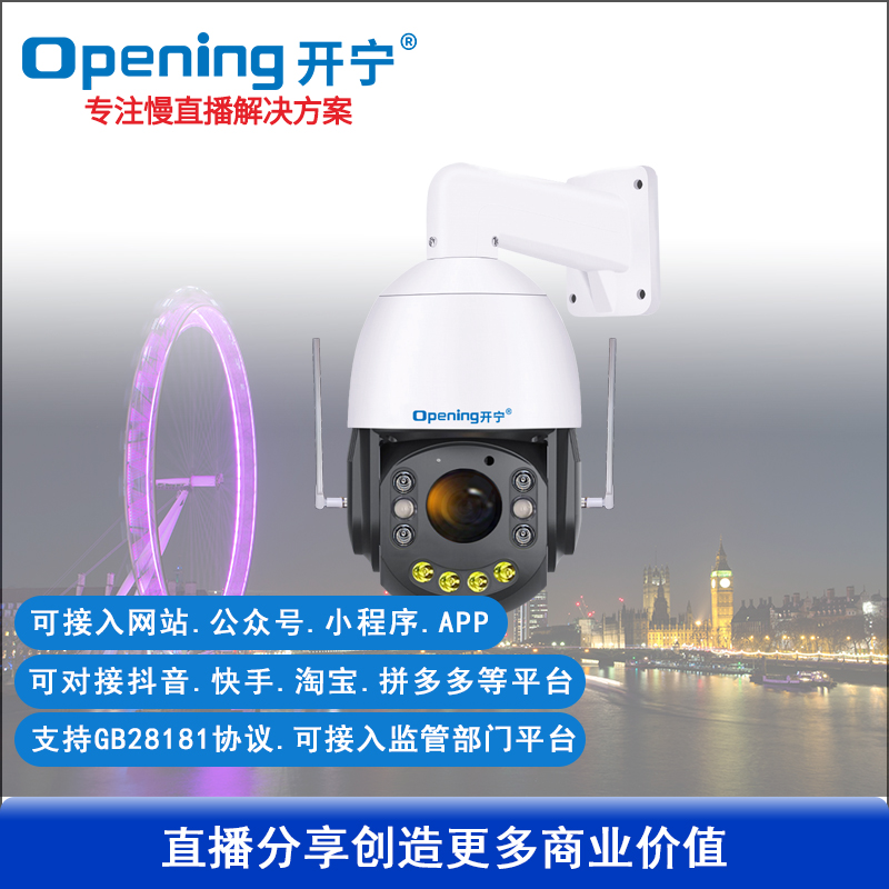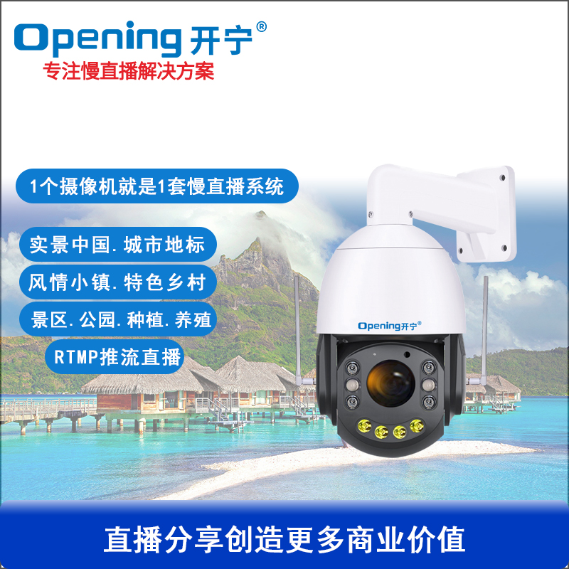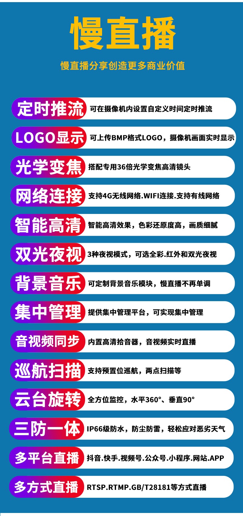 - 1、4G500萬/4K800萬4.5寸36倍雙光慢直播智能球機,一個球機就是一套慢直播系統;支持360度旋轉,36倍光學變焦,半金屬外觀,IP66防水等級; 2、內置智能4G模塊,沒有寬帶網絡的地方也能實現實時慢直播; 3、不僅可以監控監管錄像,還可以實時慢直播分享創造更多商業價值; 4、美景中國.智慧景區.城市慢直播.動物慢直播.融媒體慢直播.央視頻慢直播.戶外直播等慢直播; 5、無需下載安裝APP,簡單實用;不限觀看人數,創造更多商業價值; 6、RTMP推流直播高清攝像頭;可生成慢直播二維碼,只需掃碼即可觀看慢直播; 7、可接入網站.公眾號.小程序.APP;可對接抖音.快手.視頻號.淘寶.拼多多等平臺; 8、支持GB28181協議;可接公安.食品.工地.生產.教育.畜牧.旅游等監管部門平臺; 9、支持4G/WiFi/有線連接,沒有寬帶網絡用4G流量,有寬帶網絡可用wifi/網線連接; 10、6顆高效能點陣紅外燈,4顆高效能點陣白光燈,夜視5-100米;36倍變焦高清鏡頭; 11、內置高清保真拾音器,聲音視頻同步慢直播;DC12V供電; 12、免費提供集中管理平臺,可實現集中管理慢直播攝像頭,有效提高工作效率; 13、慢直播首選4K800萬高清智能球機,美景中國、實景中國慢直播好幫手! 14、水平360度無限位旋轉,垂直90度;水平轉速40度/秒,垂直轉速30度/秒;支持256個預置位 8組巡航8組掃描,支持水平掃描,2點區域掃描,隨機掃描;