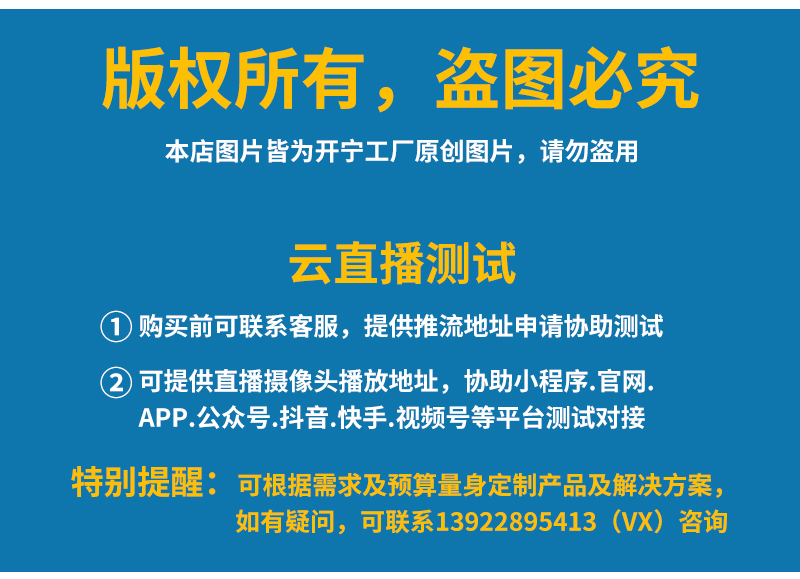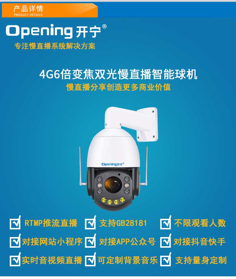 - 1、4G400萬/500萬/4K800萬/1200萬4寸6倍變焦全彩慢直播智能球機,一個球機就是一套慢直播系統;支持360度旋轉,6倍光學變焦,半金屬外觀,IP66防水等級; 2、內置智能4G模塊,沒有寬帶網絡的地方也能實現實時慢直播; 3、支持4G/WiFi/有線連接,沒有寬帶網絡用4G流量,有寬帶網絡可用wifi/網線連接; 4、不僅可以監控監管錄像,還可以實時慢直播分享創造更多商業價值; 5、美景中國.城市慢直播.文旅慢直播.融媒體慢直播.央視頻慢直播.交通慢直播.戶外直播等慢直播 6、無需下載安裝APP,簡單實用;不限觀看人數,創造更多商業價值; 7、RTMP推流直播高清攝像頭;可生成慢直播二維碼,只需掃碼即可觀看慢直播; 8、可接入網站.公眾號.小程序.APP;可對接抖音.快手.視頻號.京東.淘寶.拼多多等平臺; 9、支持GB28181協議;可接公安.食品.工地.生產.教育.畜牧.旅游等監管部門平臺; 10、支持另外定制內置插卡,可存儲卡存儲錄像; 11、6顆高效能點陣暖光燈,全彩夜視1-80米;6倍光學高清變焦鏡頭; 12、內置高清保真拾音器,聲音視頻同步慢直播;DC12V供電; 13、免費提供集中管理平臺,可實現集中管理慢直播設備,有效提高工作效率;; 14、慢直播首選4K800萬智能全彩超高清智能球機,美景中國、實景中國慢直播好幫手! 15、水平360度無限位旋轉,垂直90度;水平轉速40度/秒,垂直轉速30度/秒;支持256個預置位 8組巡航8組掃描,支持水平掃描,2點區域掃描,隨機掃描;