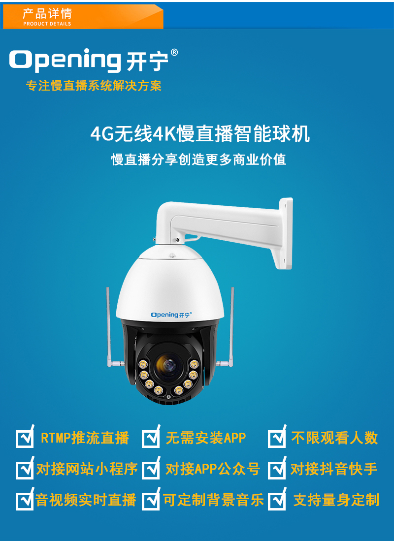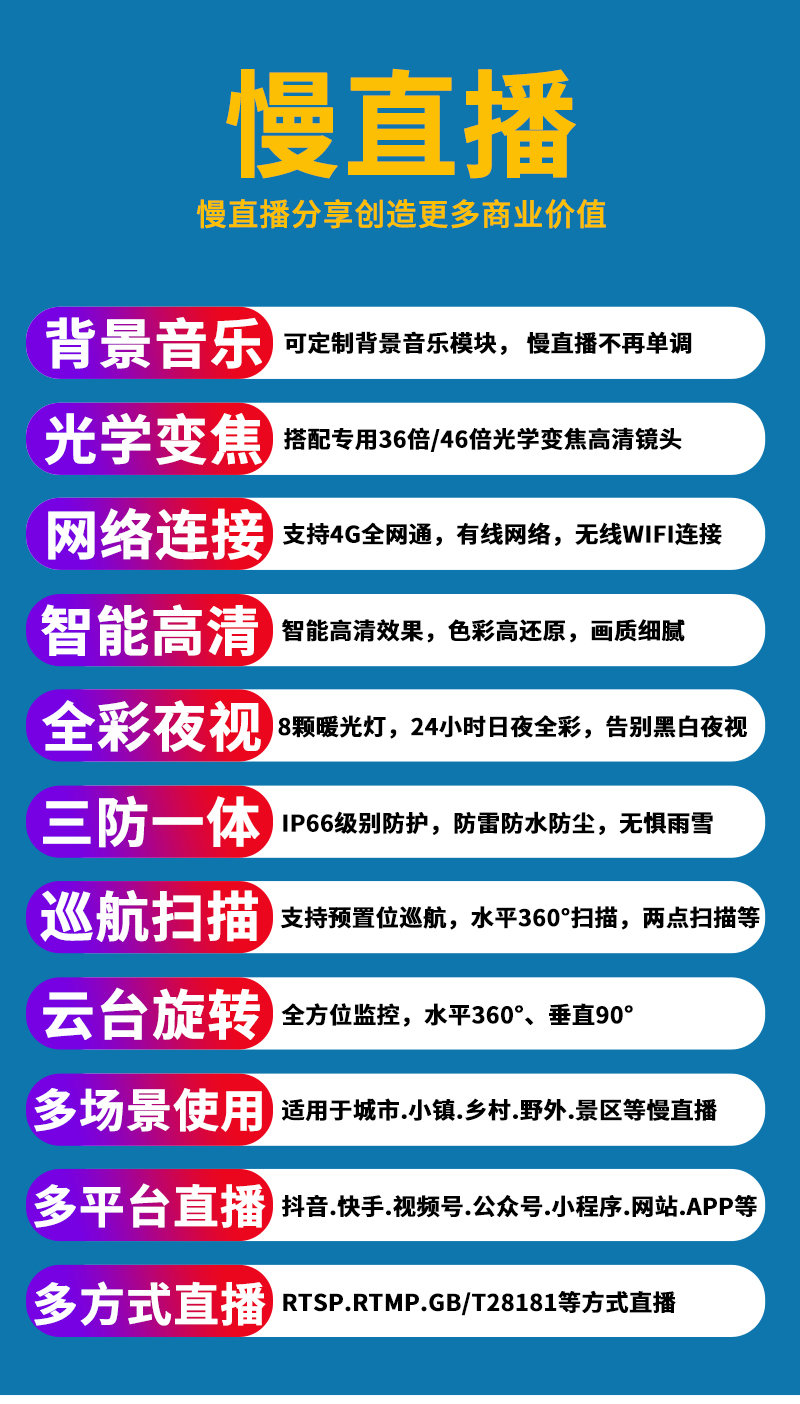 - 1、500萬/800萬7寸4G全彩慢直播智能球機,一個球機就是一套慢直播系統;支持360度旋轉,36倍/46倍光學變焦,金屬外觀,IP66防水等級;