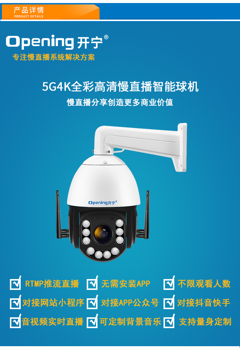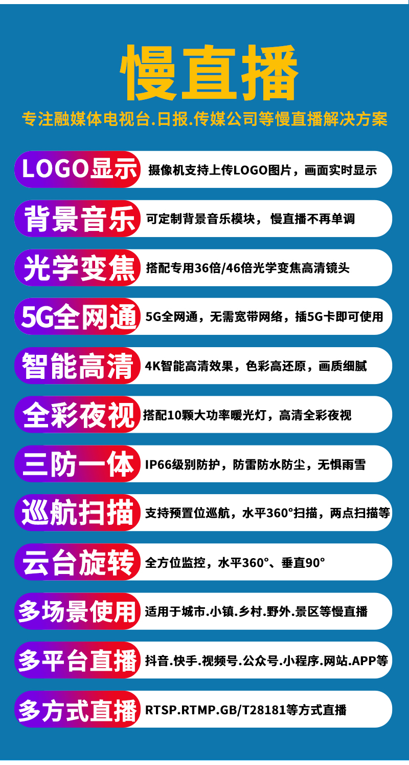 - 1、500萬/800萬6寸5G全彩慢直播智能球機,一個球機就是一套慢直播系統;支持360度旋轉,36倍/46倍光學變焦,半金屬外觀,IP66防水等級;