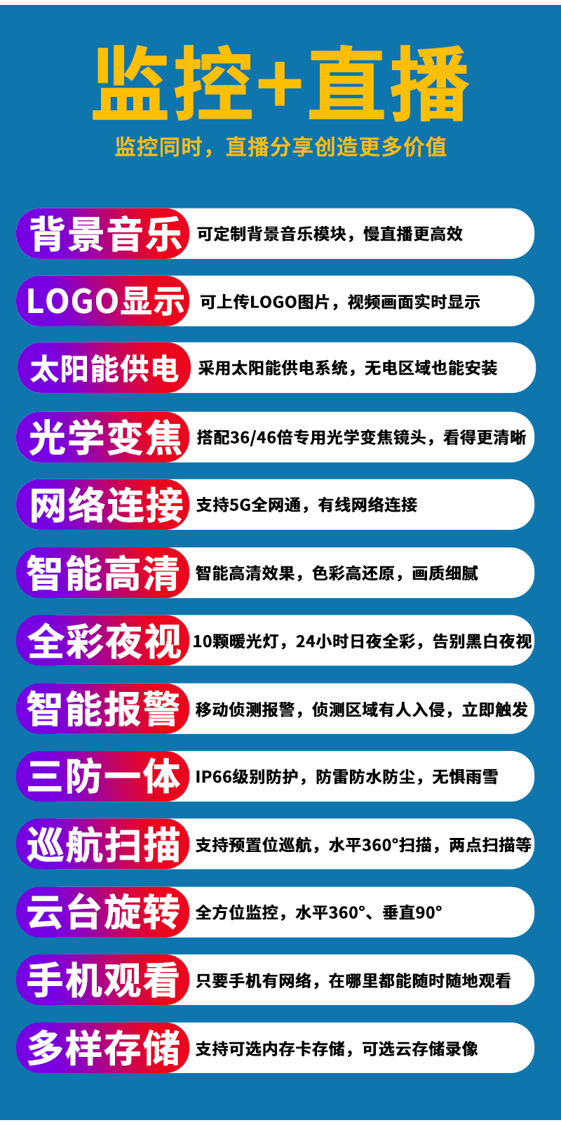 - 1、500萬/800萬6寸5G全彩慢直播智能球機,一個球機就是一套慢直播系統(tǒng);支持360度旋轉(zhuǎn),36倍/46倍光學變焦,半金屬外觀,IP66防水等級;
