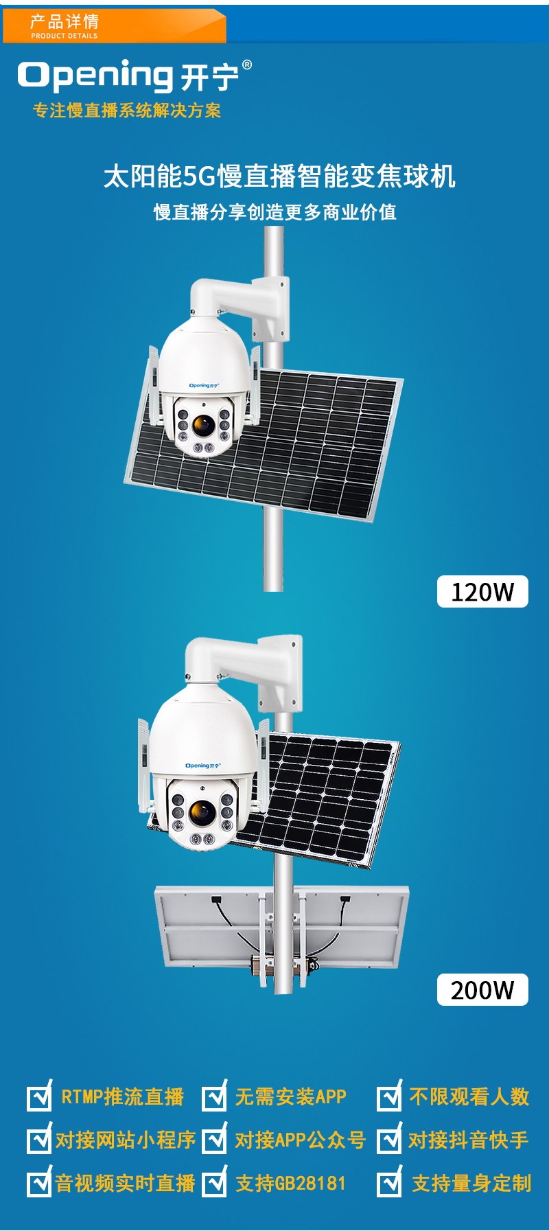 - 1、500萬/800萬7寸5G全彩慢直播智能球機,一個球機就是一套慢直播系統;支持360度旋轉,36倍/46倍光學變焦,金屬外觀,IP66防水等級;
