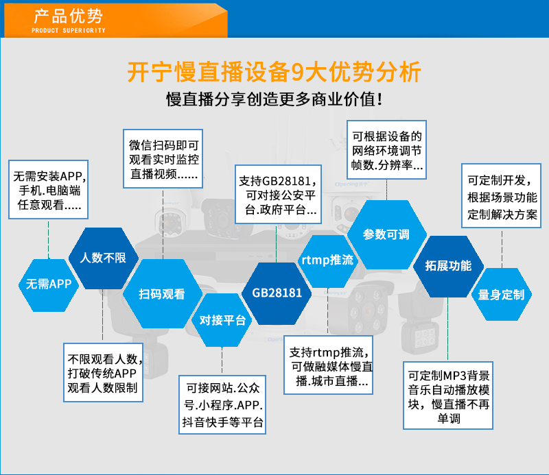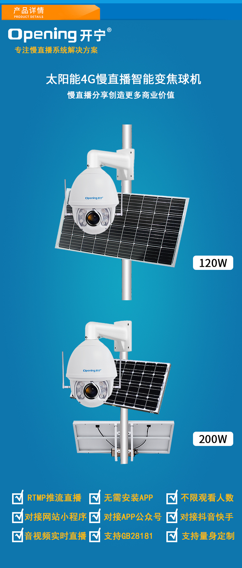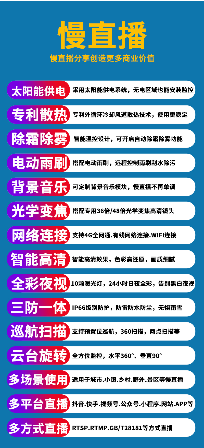 - 1、4K800萬7寸4G全彩慢直播智能球機,一個球機就是一套慢直播系統;水平360度無限位旋轉,垂直100度旋轉;支持256個預置位 8組巡航8組掃描,支持水平掃描,2點區域掃描,隨機掃描;36倍/48倍光學變焦,金屬外觀,IP66防水等級; 2、采用外循環冷卻風道散熱技術和視頻分析調光技術,整體提升產品使用壽命1倍以上; 3、自動除霜、除霧功能(手動開啟),外置雨刷設計,確保視頻高清畫面更清晰; 4、內置智能5G模塊,沒有寬帶網絡的地方也能實現實時慢直播; 5、支持5G/有線連接,沒有寬帶網絡用5G流量,有寬帶網絡用網線連接; 6、不僅可以監控錄像,還可以實時慢直播分享創造更多商業價值; 7、美景中國.城市慢直播.5G慢直播.融媒體慢直播.央視頻慢直播.交通慢直播.戶外慢直播等慢直播 8、無需下載安裝APP,簡單實用;不限觀看人數,創造更多商業價值; 9、RTMP推流直播高清攝像頭;可生成慢直播二維碼,只需掃碼即可觀看慢直播; 10、可接入網站.公眾號.小程序.APP;可對接抖音.快手.視頻號.視頻號.京東.淘寶.拼多多等平臺; 11、支持GB28181協議;可接公安.食品.工地.生產.教育.畜牧.旅游等監管部門平臺; 12、支持另外定制內置插卡,可存儲卡存儲錄像; 13、10顆進口大功率高效能點陣暖光燈,紅外夜視1-160米;;36倍/48倍變焦高清鏡頭; 14、內置高清保真拾音器,聲音視頻同步慢直播;DC12V供電; 15、免費提供集中管理平臺,可實現集中管理播監控攝像頭,有效提高工作效率;; 16、慢直播首選4K800萬智能全彩超高清智能球機,美景中國、實景中國慢直播好幫手! 17、可另外配置高清晰大功率喇叭,APP語音對講,智能語音警戒報警; 18、水平360度無限位旋轉,垂直100度;水平轉速0.01度-120度/秒,垂直轉速0.01度-100度/秒;支持256個預置位 8組巡航8組掃描,支持水平掃描,2點區域掃描,隨機掃描;