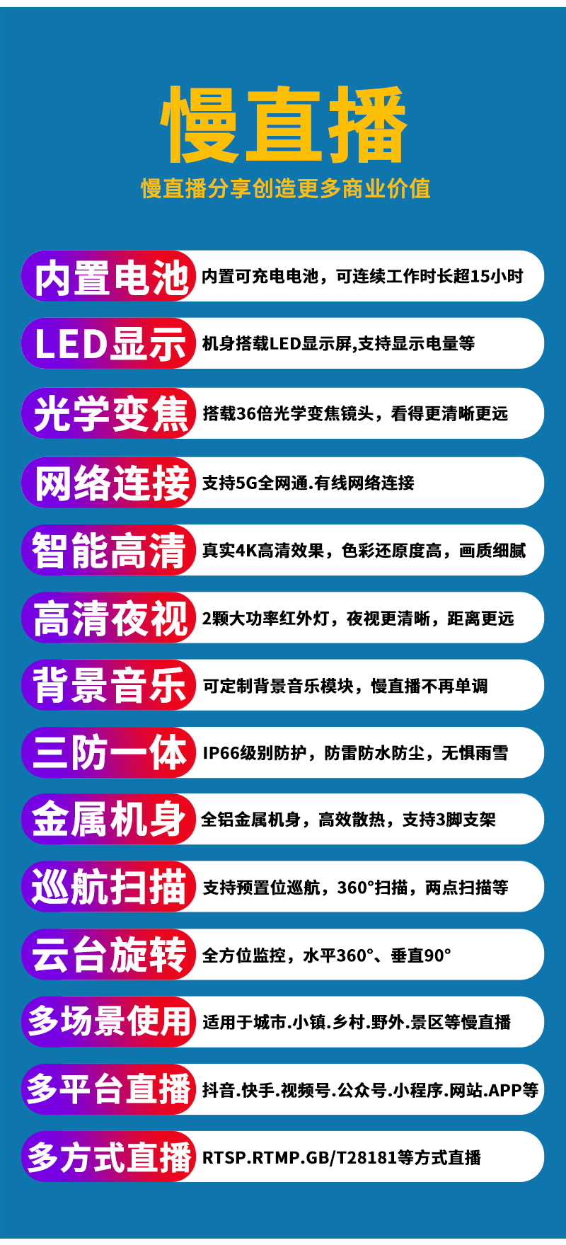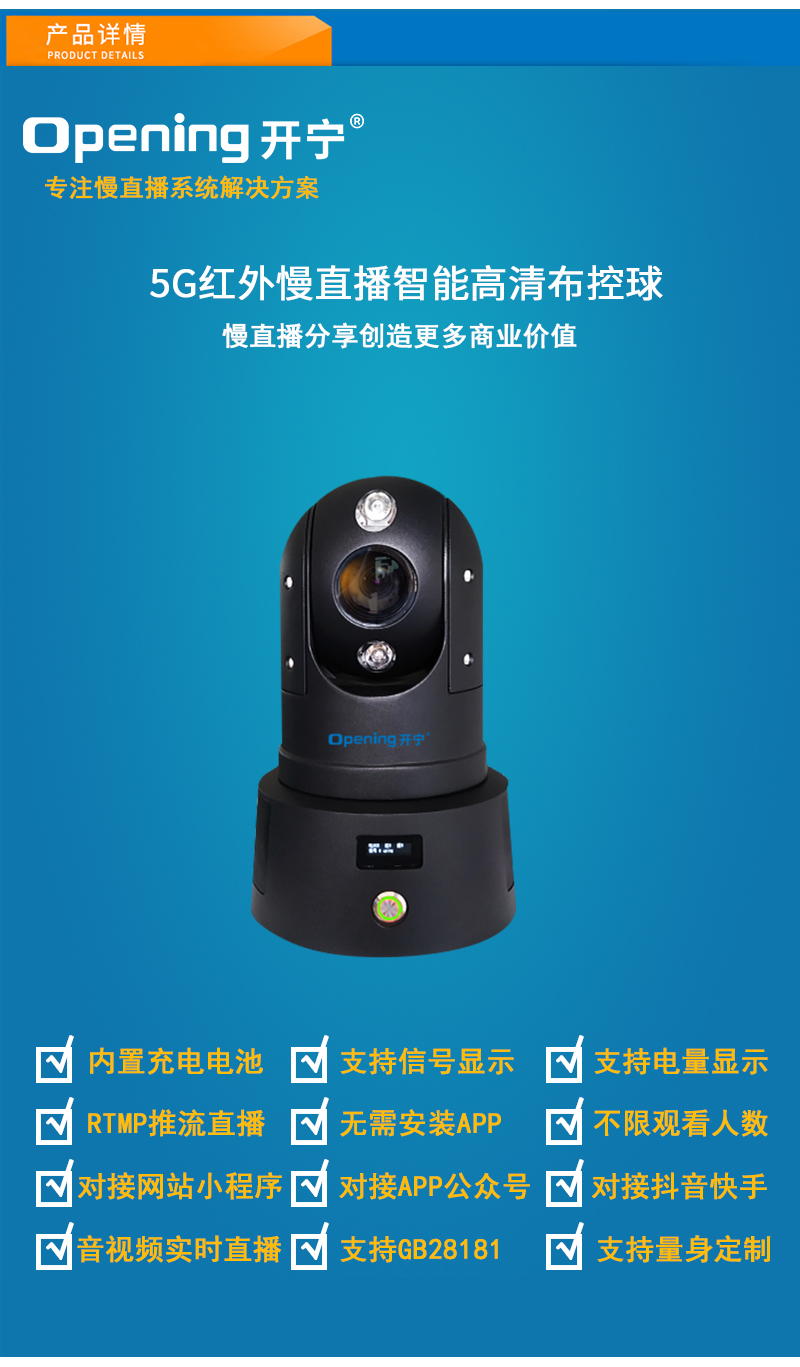 - 1、4K800萬5G紅外慢直播智能高清布控球,一個(gè)布控球就是一套完整的慢直播系統(tǒng);支持360度水平及90度垂直旋轉(zhuǎn),36倍光學(xué)變焦高清鏡頭,全金屬外觀,IP66防水等級(jí);內(nèi)置大容量鋰電池,連續(xù)工作時(shí)長超過15小時(shí);配置便攜式牢固金屬三腳架;可滿足臨時(shí)快速搭建慢直播系統(tǒng)搭建需求;