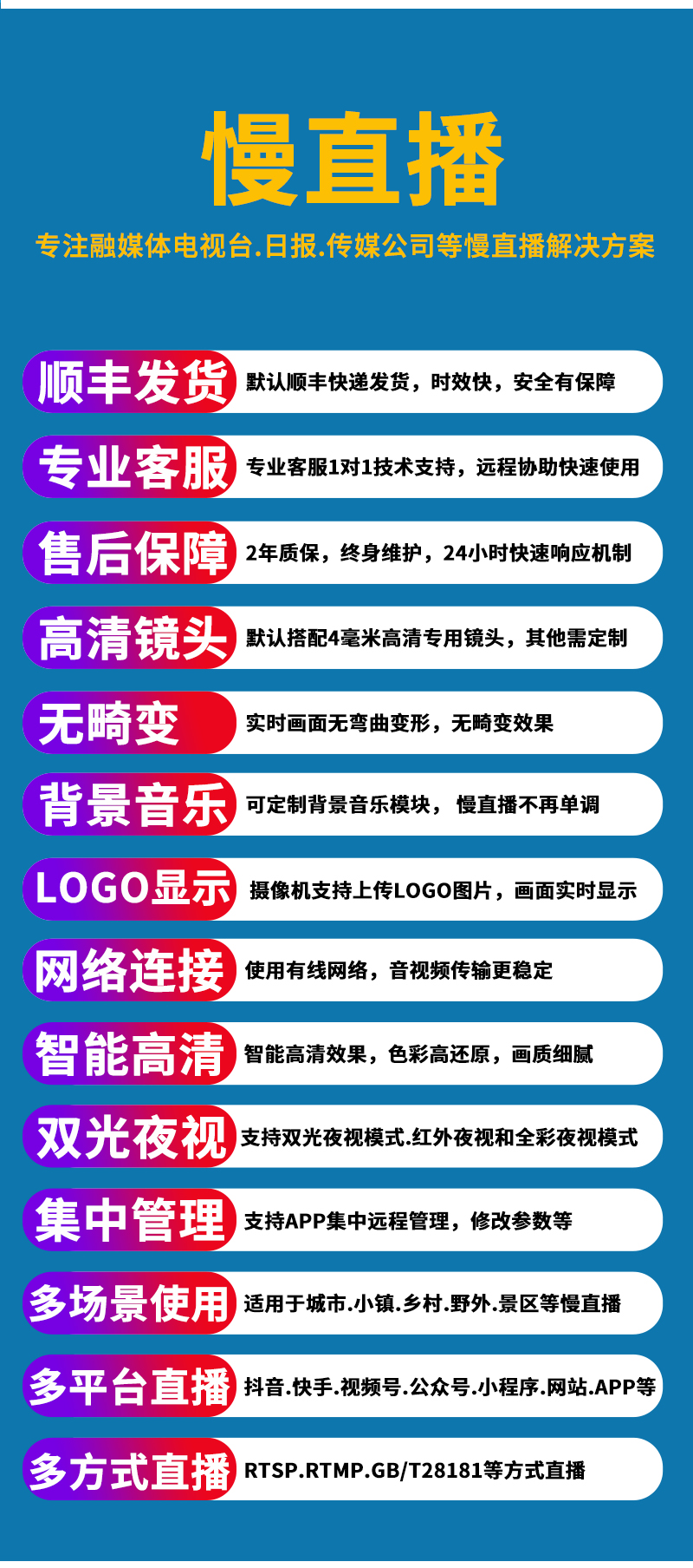 - 1、4K800萬/500萬/400萬/300萬無畸變有線慢直播智能半球,一個無畸變半球就是一套慢直播系統; 2、不僅可以監控監管錄像,還可以實時慢直播分享創造更多商業價值; 3、兵乓球比賽.網球比賽.籃球比賽.臺球比賽.排球比賽.儀器儀表監管.賽事慢直播等慢直播; 4、無需下載安裝APP,簡單實用;不限觀看人數,創造更多商業價值; 5、RTMP推流直播高清攝像頭;可生成慢直播二維碼,只需掃碼即可觀看慢直播; 6、可接入網站.公眾號.小程序.APP;可對接抖音.快手.視頻號.京東.淘寶.拼多多等平臺; 7、RTMP推流直播高清攝像頭;可接公安.食品.工地.生產.教育.畜牧.旅游等監管部門平臺; 8、高清慢直播、本地錄像錄音、報警多功能于一體;支持64/128G內存卡; 9、3顆點陣紅外燈,3顆點陣白光燈,無畸變高清定焦鏡頭(默認3.6mm),夜視5-20米; 10、APP可選擇紅外模式、全彩模式和智能模式三種模式其中一種模式; 11、內置高清保真拾音器,有聲有色實時直播;DC12V供電,可選POE供電; 12、免費提供集中管理平臺,可實現集中管理慢直播設備,有效提高工作效率; 13、智能人形檢測報警,手機推送。