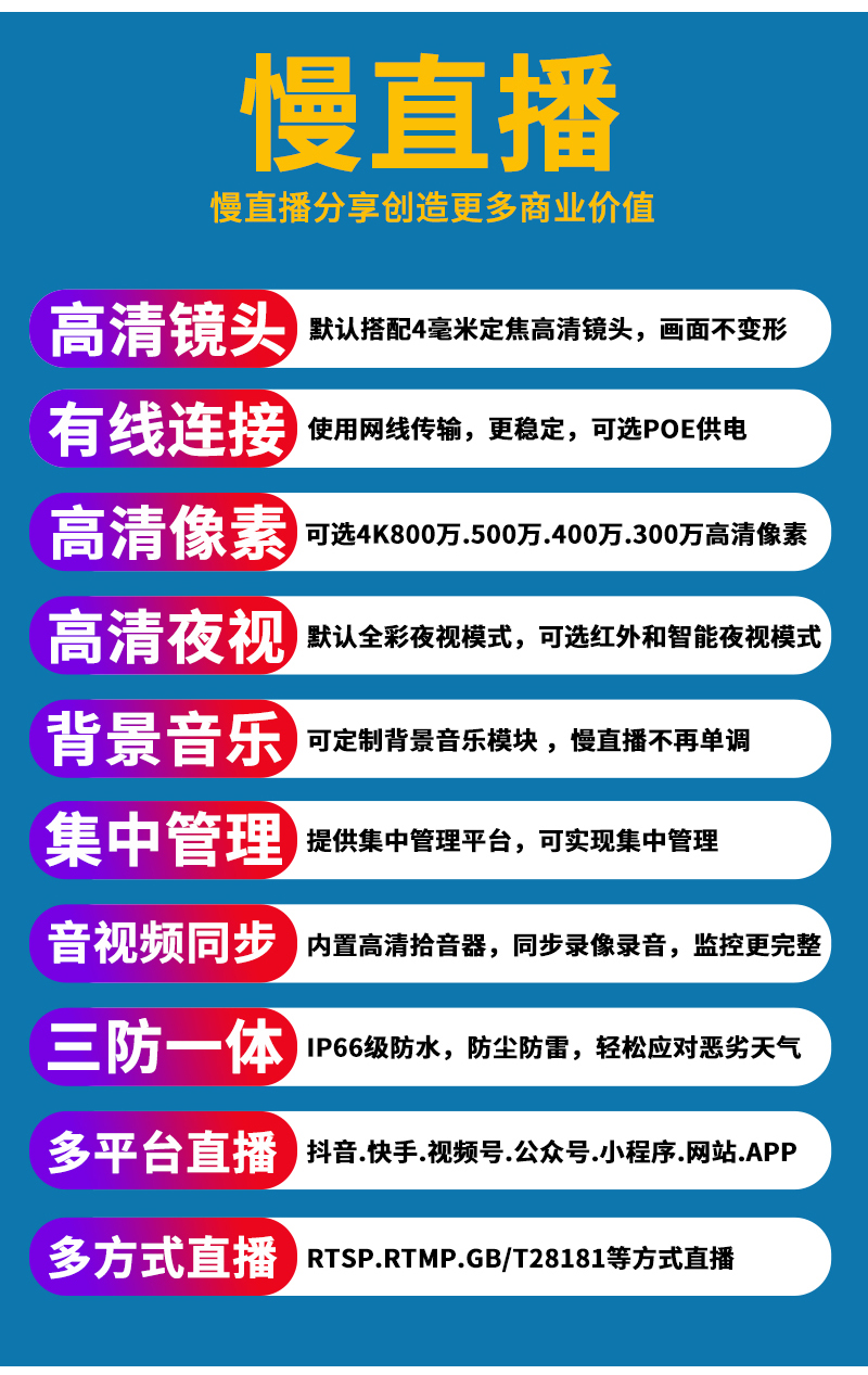 - 1、300萬(wàn)/500萬(wàn)/800萬(wàn)/1200萬(wàn)雙光慢直播高清攝像機(jī),一個(gè)攝像機(jī)就是一套慢直播系統(tǒng);