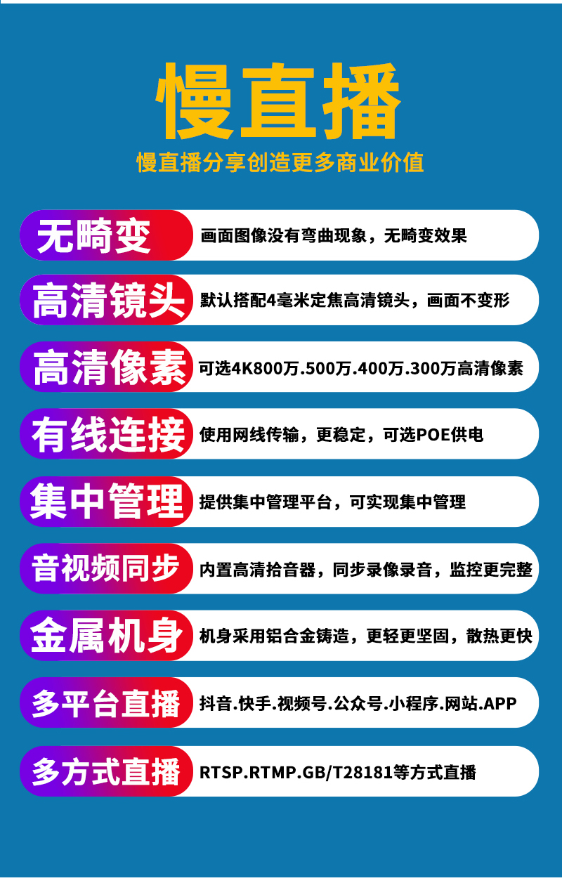 - 1、300萬/500萬/800萬紅外無畸變慢直播工業方塊攝像機,一個攝像機就是一套慢直播系統;