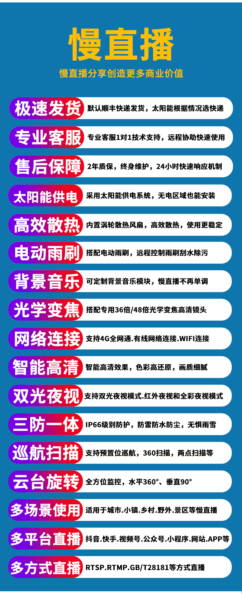 - 1、500萬/800萬6寸4G全彩慢直播智能雨刷球機,一個球機就是一套慢直播系統;支持360度旋轉,36倍/46倍光學變焦,半金屬外觀,IP66防水等級;