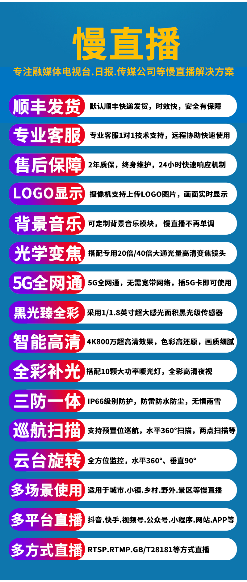 - 1、4K800萬6寸5G 20倍黑光臻全彩慢直播智能高清球機,一個球機就是一套慢直播系統;支持360度旋轉,支持預置點和巡航,20倍光學變焦,半金屬外觀,IP66防水等級;